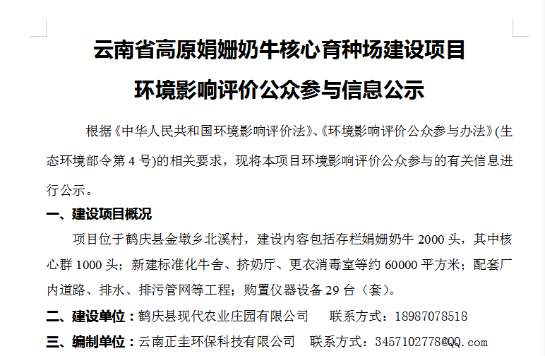 云南省高原娟姍奶牛核心育種場建設(shè)項目 環(huán)境影響評價公眾參與信息公示
