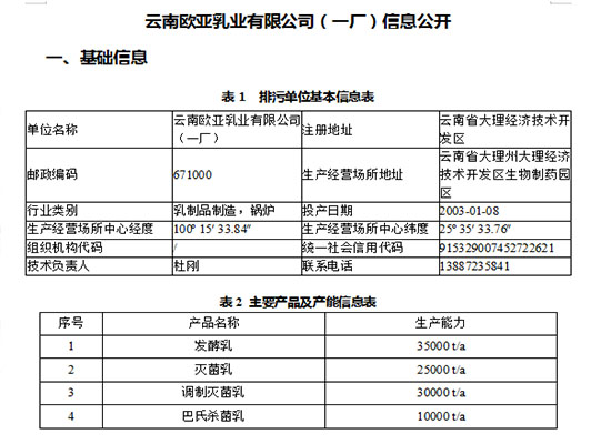 云南歐亞乳業(yè)有限公司(二廠)信息公開