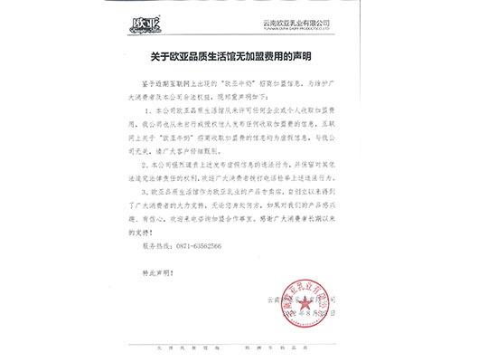 關(guān)于歐亞品質(zhì)生活館無加盟費用的聲明